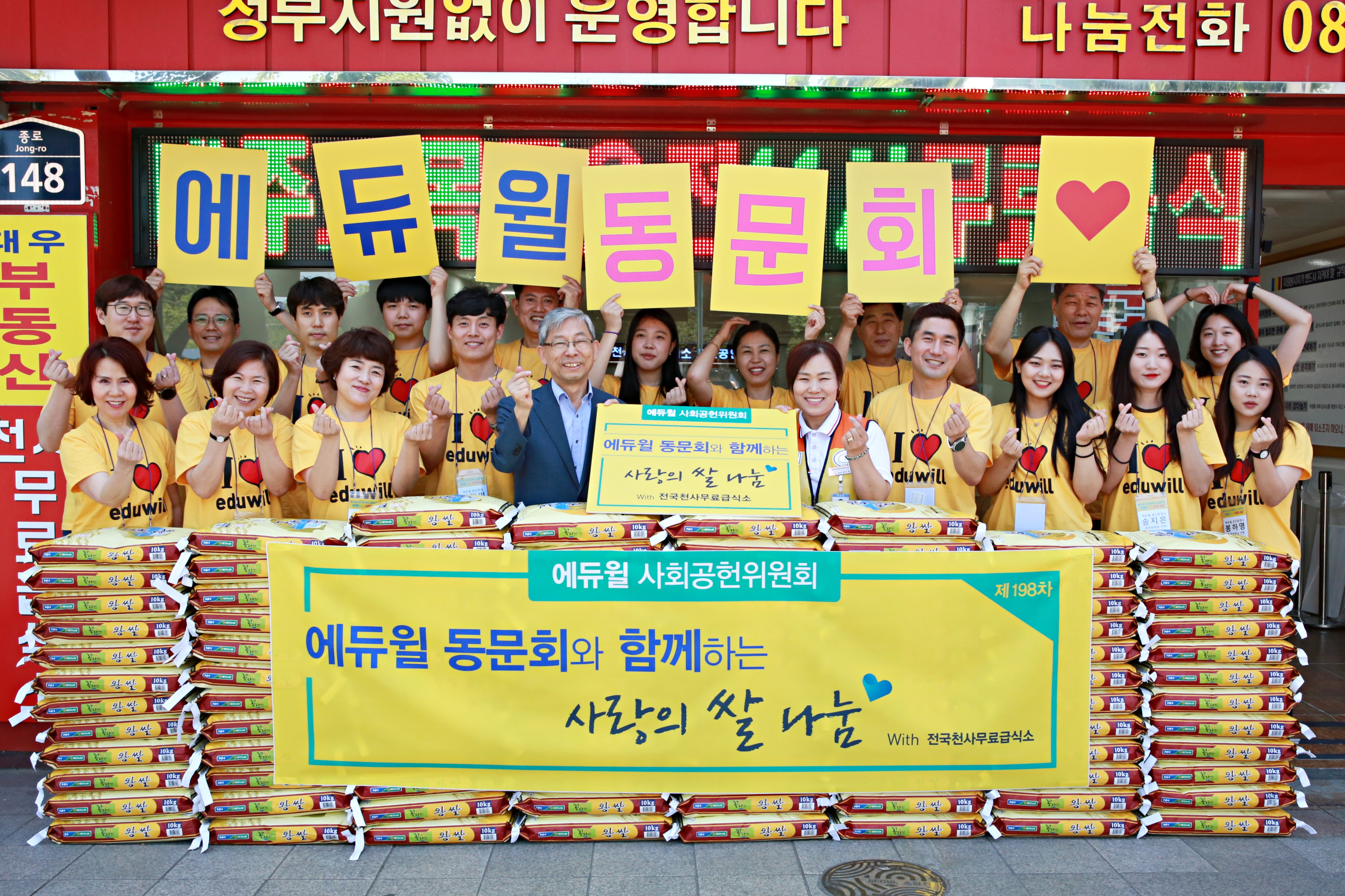 쌀 100포대를 기증하고, 무료 급식 봉사 활동을 진행했습니다 ^^