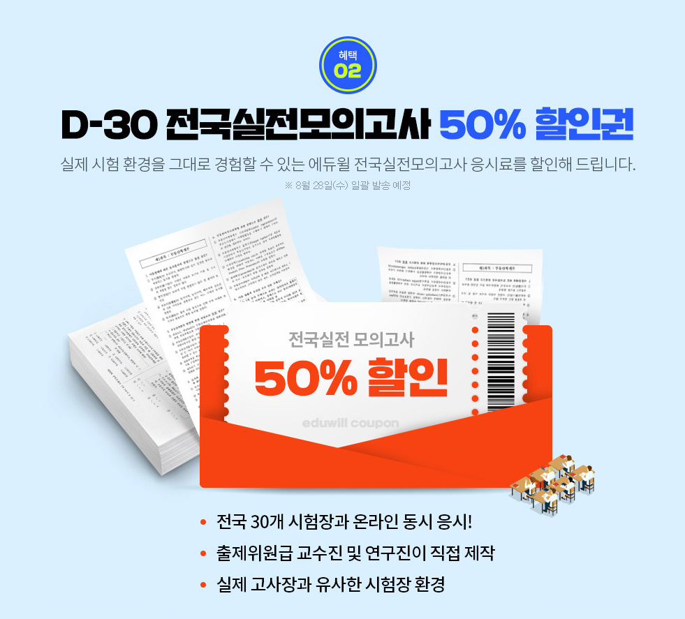 'D-30 전국실전모의고사' 응시료 50% 할인권을 받으실 수 있어요!