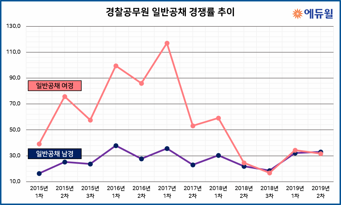 나머지 10차례의 시험에서는 여경의 경쟁률이 남경의 경쟁률보다 높았는데요!