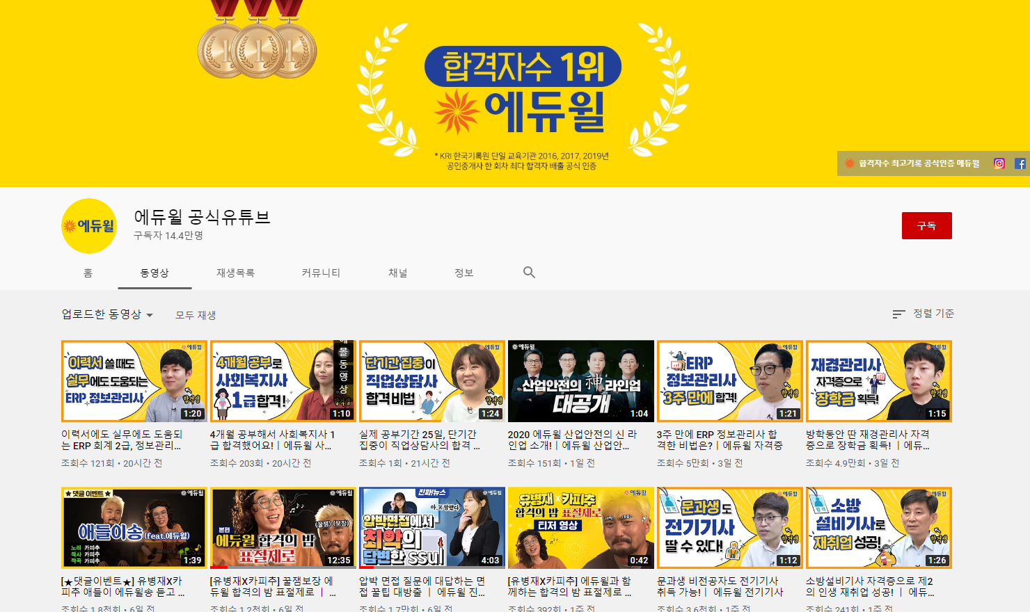활발한 운영 덕에 에듀윌 유튜브 공식 채널은