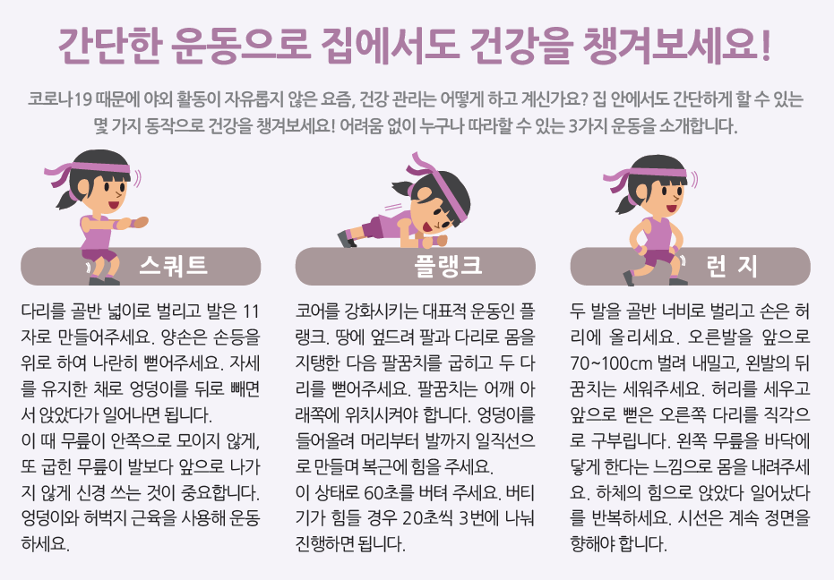 집 안에서도 간단하게 할 수 있는 몇 가지 동작으로 건강을 챙겨보세요!
