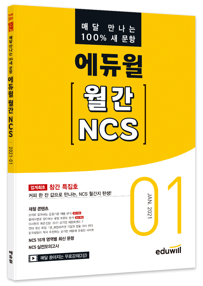 에듀윌이 공기업 취준생을 위해 시시각각 변하는 채용 시장에 대응할 수 있는 특별한 월간지를 창간했습니다. 에듀윌 월간 NCS는 매달 최신 채용 트렌드를 분석하여 제공하고, 직접 NCS 문제를 풀어볼 수 있도록 매월 최신 스타일의 신규 문항을 제공합니다. 영역별 문항과 함께 기본적인 이론, 문제 접근 방법, 필요 지식 등을 제공해 다방면의 도움을 선사하며, 실전모의고사를 제공해 실제 시험에 적응할 수 있도록 도와드립니다.