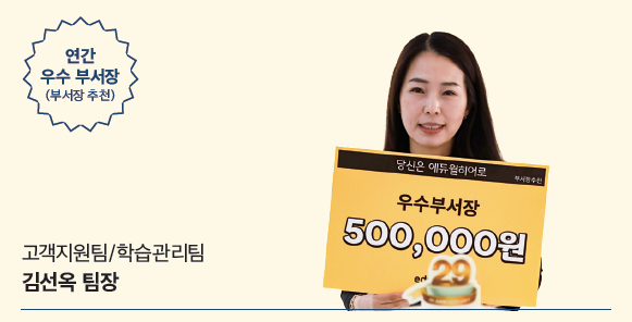 “말할 수 없이 기쁘다. 수상 소식을 들었을 때 스스로에게 잘했다, 수고했다 칭찬하면서 앞으로는 상이 부끄럽지 않게 뭐든 더 잘해내겠다고 새롭게 다짐했다.” 2년 연속 연간 우수부서장에 선정된 김선옥 팀장에게 지난 2020년, 특히 기억에 남는 업무는 처음 맡은 배송 업무였습니다. “배송 업무는 처음이라 막막했지만, 처음이라 뭐든지 시도해볼 수 있다는 점에서 재미있었다. 물류업체를 변경하고 프리북 전용 안전봉투를 제작하는 등 프리북 발송 프로세스를 변경한 것이 가장 기억에 남고 보람된 일”이라고 설명했습니다. 김 팀장은 이번 수상과 관련해 감사하고 싶은 사람도 많은데요. 그는 “새로운 업무를 맡겨주신 김윤희 본부장님, 열정만 갖고 헤매고 있을 때마다 도와주신 유관부서 팀장님들, 밤낮으로 고생 중인 고객지원팀 및 학습관리 팀원 모두에게 공을 돌리고 싶다”고 전했습니다. 김선옥 팀장의 올해 목표는 고객에게 기대를 뛰어넘는 ‘와우’ 경험을 제공하는 것입니다. 이미 목표 달성을 위한 구체적 계획까지 세워놓았다는 김선옥 팀장은 올해도 좋은 성과를 위해 열심히 달리겠다는 각오를 밝혔습니다.