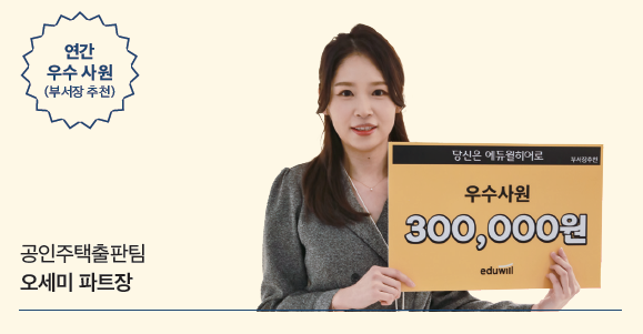 에듀윌 공인중개사 교재는 지난 한 해 YES24 공인중개사 부문 월별 베스트셀러 1위를 놓친 적이 없습니다. 공인중개사 교재 개발을 담당하고 있는 오세미 파트장에겐 무엇보다 뜻 깊은 일입니다. “경쟁이 치열한 공인중개사 수험 시장 속에서 1등을 유지하는 것이 쉽지 않은 일이기도 하고, 모두가 함께 협업하여 얻어낸 성과라 더 값지게 느껴진다.” 공인주택출판팀과 함께 달성한 성과 이외에 연간 우수사원 선정이라는 특별한 성과까지 이뤄낸 오 파트장은 이 역시 팀장님을 비롯한 공인주택출판팀의 덕이라며 감사의 인사를 전했습니다. 그는 “팀장님과 공인주택 출판팀, 그리고 묵묵히 함께 고생하고 있는 파트원들에게 감사한 마음이 크다. 각자 맡은 영역을 성실하게 잘 채워주고, 서로 배려하고 돕는 모습이 늘 고맙고 든든하다. 특히, 작년은 신간을 7권이나 출간해 심신이 지치기 쉬운 한 해였지만 서로에게 힘이 돼 주었기에 극복할 수 있었다”며 공을 돌렸습니다. “시장성 있는 공인중개사 신간 교재, 기획 교재를 발굴하고 싶다”는 오세미 파트장은 2021년, 수시로 바뀌는 국가 부동산 정책을 밀착 모니터링하여 전문성을 높이는 데 매진하겠다고 전했습니다.