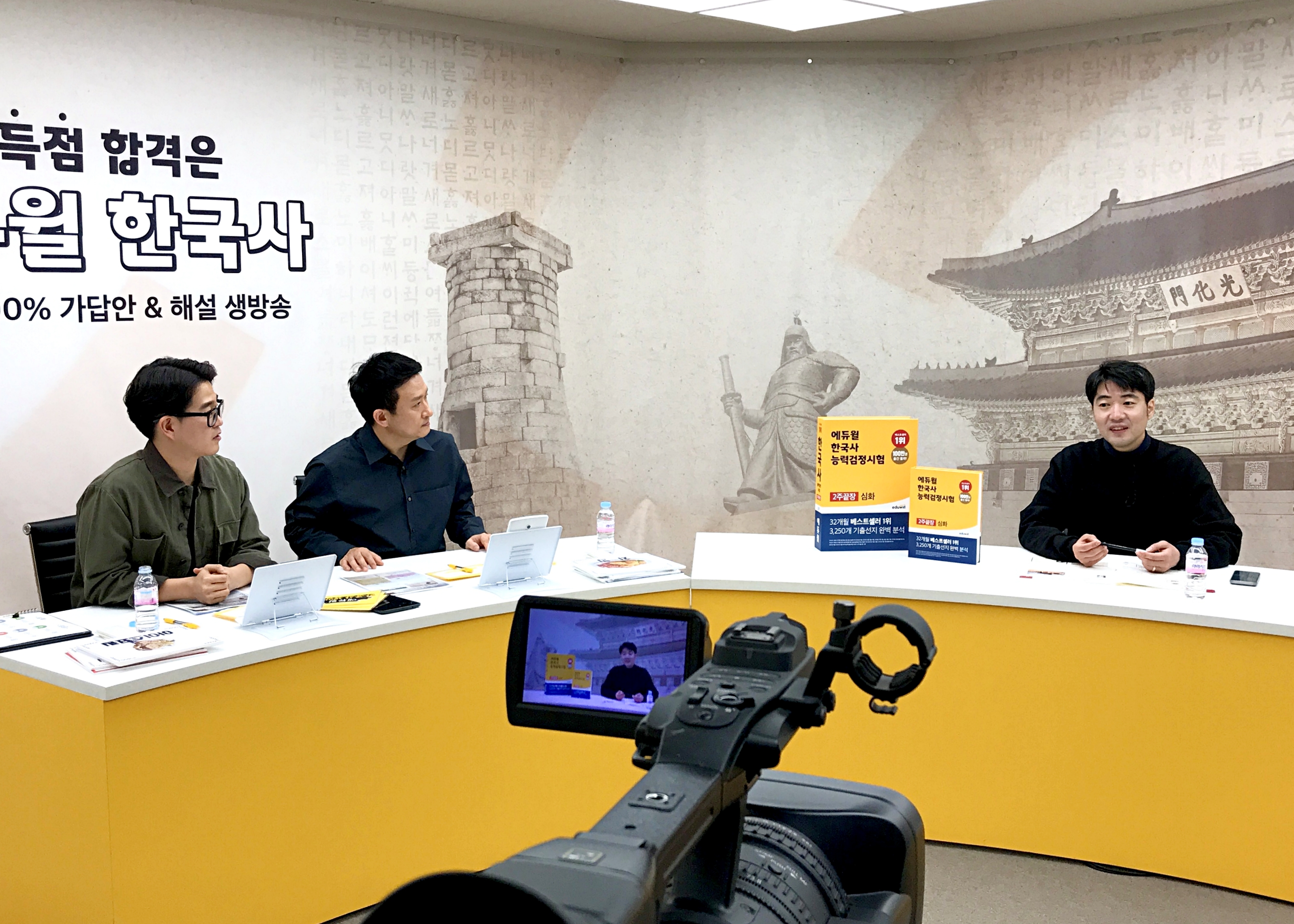 52회 가답안 생방송 역시 에듀윌 한국사 전문 MC로 활약하고 있는 출판마케팅팀 김동석 매니저와 에듀윌 홍보대사 서경석 씨가 가답안 공개 생방송의 사회를 맡았습니다. 실제로 한국사능력검정시험에 응시하고, 곧바로 생방송 촬영 스튜디오를 찾은 자격출판팀의 김선우 팀장도 참여해 이번 시험의 난이도와 논란 문제 등을 소개했습니다.