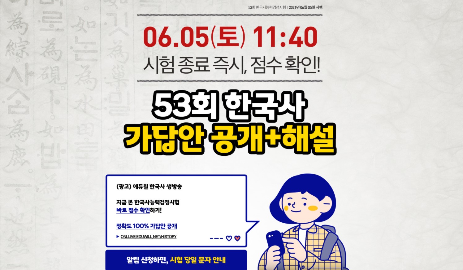 제 53회 한국사능력검정 시험은 6월 5일로 예정되어 있는데요! 이번 시험에서도 에듀윌 한국사능력검정은 빠르고 정확한 가답안을 공개할 예정입니다. 사전 신청자에 한해 시험 당일 에듀윌 한국사 생방송 안내 문자도 발송되는데요! 알림 신청자에겐 다양한 경품 혜택도 제공하고 있으니, 관심이 있으신 분들은 지금 바로 에듀윌 한국사능력검정 홈페이지에서 내용을 확인해보세요 ^^