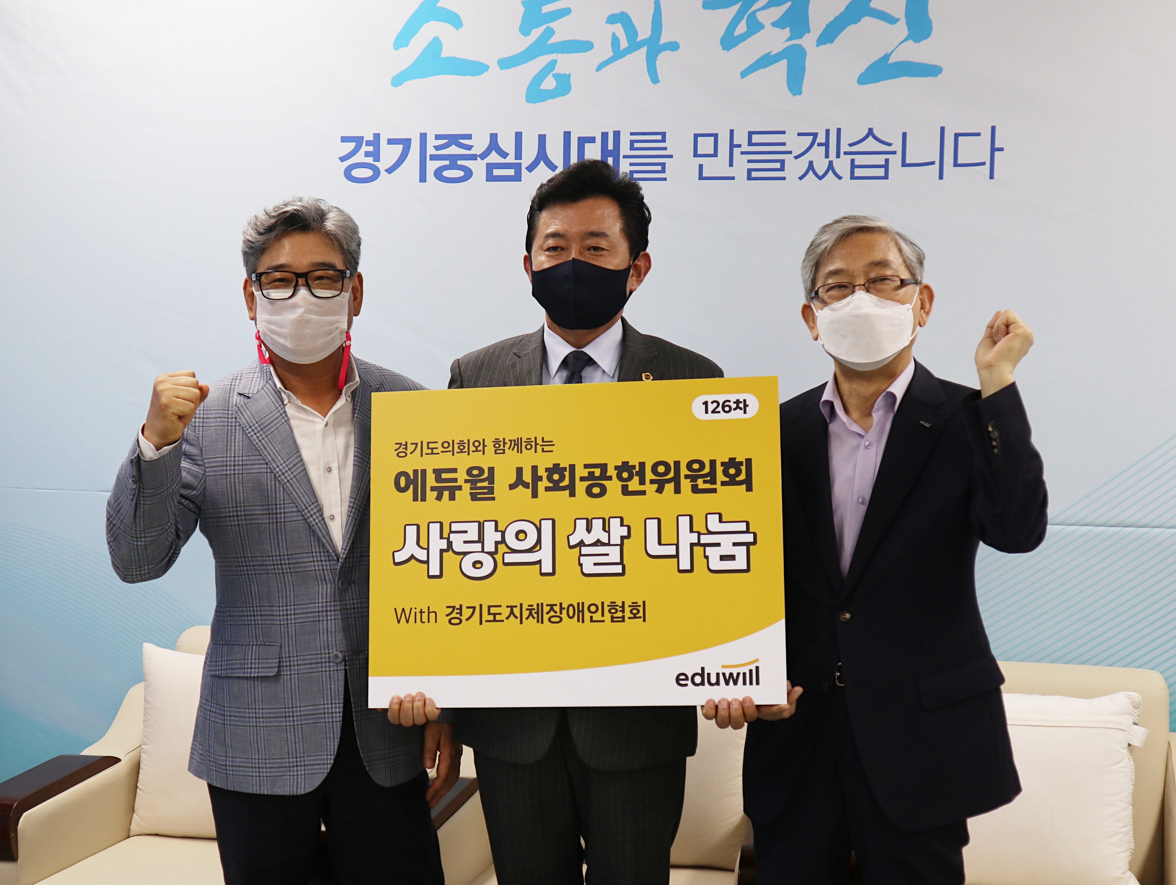 126차 에듀윌 사랑의 쌀 나눔 기증식에는 에듀윌 박명규 대표와 사회공헌위원회, 경기도지체장애인협회 김기호 협회장과 함께 협회 자문위원장인 경기도의회 박근철 의원이 특별히 참석해 자리를 빛냈습니다.
