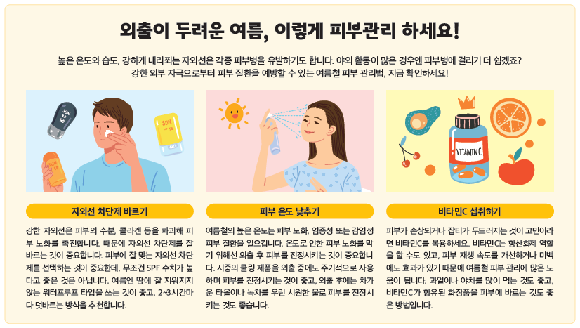 여름철의 높은 온도는 피부 노화, 염증성 또는 감염성 피부 질환을 일으킬 수 있습니다. 온도로 인한 피부 노화를 막기 위해선 외출 후 피부를 진정시키는 것이 중요합니다. 시중에 판매하고 있는 쿨림 제품을 외출 중에도 주기적으로 사용하며 피부를 진정시키는 것이 좋고, 외출 후에는 차가운 타올이나 녹차를 우린 시원한 물로 피부를 진정시키는 것도 좋습니다.