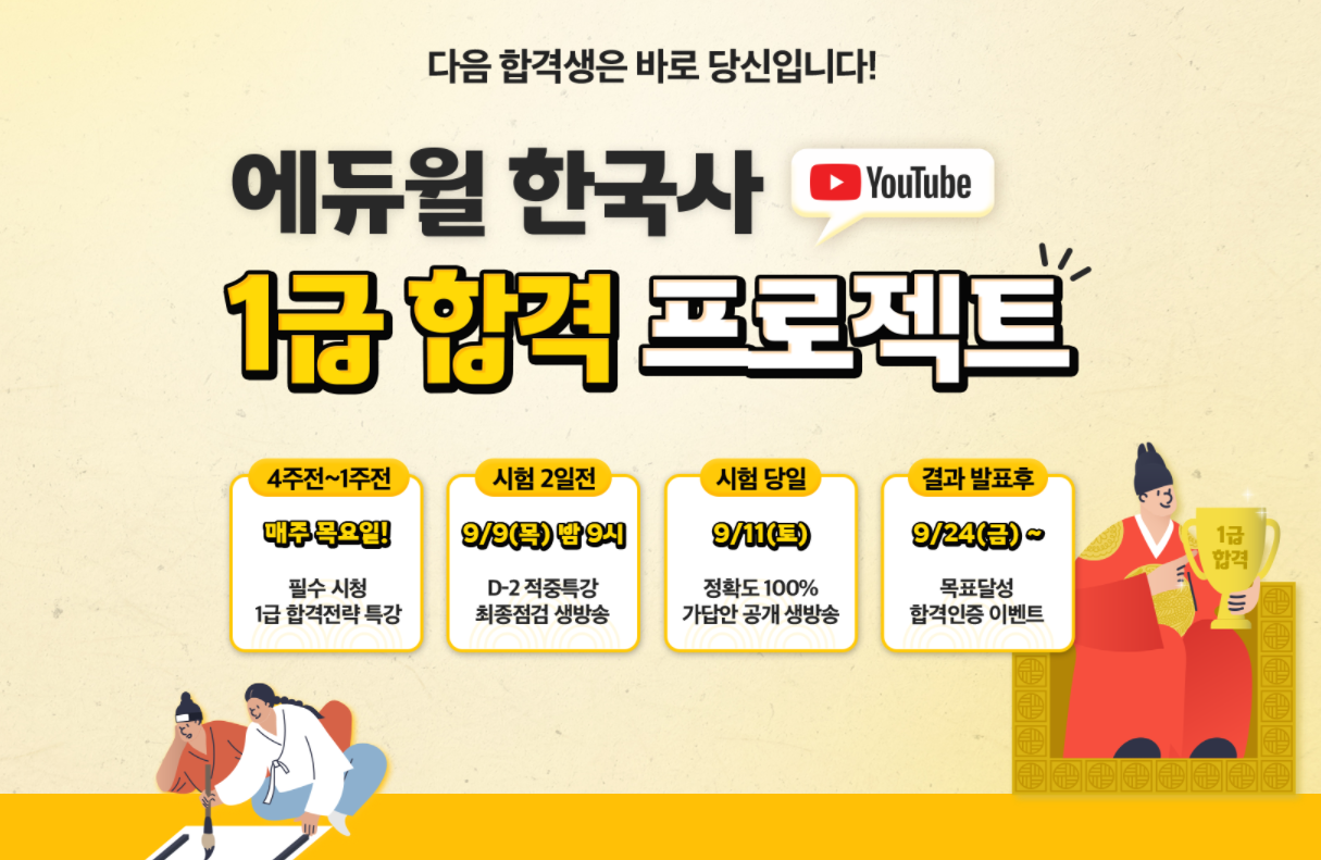 에듀윌 한국사는 9월 11일 치러지는 55회 한국사능력검정시험 당일에도 한국사 생방송을 통해 가답안 공개와 해설, 이벤트 경품까지 풍성하게 제공하며 20번째 정확도 100% 기록을 달성하겠다는 계획입니다. 당일 진행되는 가답안 공개 외에도 ‘1급 합격 프로젝트’를 통해 시험 4주 전부터 빈틈없는 서포트를 진행합니다.