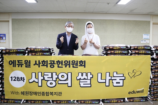 쌀 나눔 기증식에는 에듀윌 박명규 대표와 혜원장애인종합복지관장인 오현숙 미리암 수녀가 직접 참여했습니다. 오현숙 미리암 수녀는 “어려운 때에 생각지도 못한 큰 선물을 받았다. 취약 계층을 위해 사회공헌 사업에 지속적으로 관심을 기울여 주셔서 감사드린다. 기부해주신 쌀은 기관을 이용하는 장애인 여러분들을 위해 잘 활용하겠다”고 감사를 표했습니다. 이에 박명규 대표는 “소외계층을 위해 애쓰시는 많은 분들의 응원 덕에 꾸준히 사랑의 쌀 나눔을 지속할 수 있는 것 같다”며 “에듀윌 그리고 에듀윌 사회공헌위원회는 앞으로도 회사가 성장하는 만큼 더 많은 분들에게 나눔을 실천하도록 노력하겠다”고 화답했습니다.