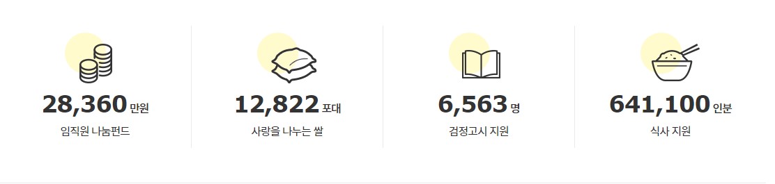 128차 쌀 나눔을 포함해 에듀윌이 2011년부터 지금까지 기부한 쌀은 총 12,822포대로, 이는 64만 1천여 명이 한 끼 식사를 해결할 수 있는 양입니다. 에듀윌 사회공헌위원회는 사랑의 쌀 나눔 외에도 보호관찰 청소년을 위한 검정고시 지원, 가정형편이 어려워 학업에 집중할 수 없는 중학생을 위한 장학금 지원, 임직원과 회사가 함께 기부금을 모금하는 임직원 나눔펀드 등 다양한 사회공헌 활동을 꾸준히 펼치고 있는 중입니다.