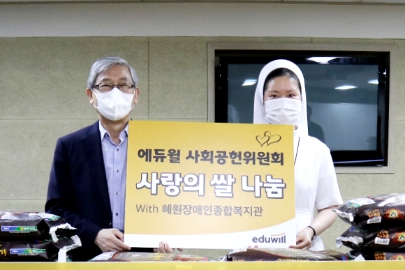 쌀 나눔 기증식에는 에듀윌 박명규 대표와 혜원장애인종합복지관장인 오현숙 미리암 수녀가 직접 참여했습니다. 오현숙 미리암 수녀는 “어려운 때에 생각지도 못한 큰 선물을 받았다. 취약 계층을 위해 사회공헌 사업에 지속적으로 관심을 기울여 주셔서 감사드린다. 기부해주신 쌀은 기관을 이용하는 장애인 여러분들을 위해 잘 활용하겠다”고 감사를 표했습니다. 이에 박명규 대표는 “소외계층을 위해 애쓰시는 많은 분들의 응원 덕에 꾸준히 사랑의 쌀 나눔을 지속할 수 있는 것 같다”며 “에듀윌 그리고 에듀윌 사회공헌위원회는 앞으로도 회사가 성장하는 만큼 더 많은 분들에게 나눔을 실천하도록 노력하겠다”고 화답했습니다.